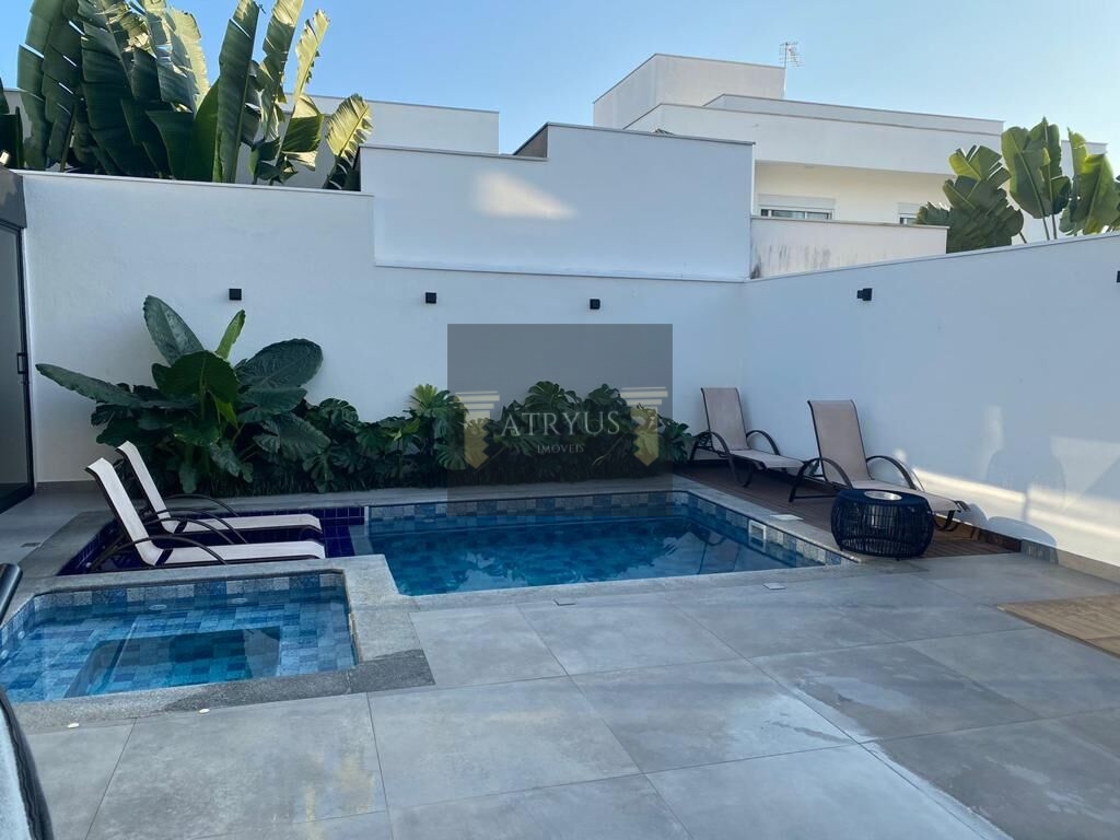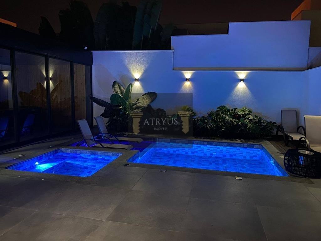 Sobrado com 3 suítes, sendo 1 máster com closet, todos com piso laminado. Piso inferior todo em Porcelanato. Sala 2 ambientes. Cozinha. Escritório. Lavanderia. Lavabo com arte na parede. Espaço gourmet totalmente coberto e fechado com portas de vidro. Piscina aquecida com jacuzzi independente. Quarto de despejo. Banheiro área externa. Corredor lateral coberto com vidro retrátil automático. Jardim interno com jardim vertical.